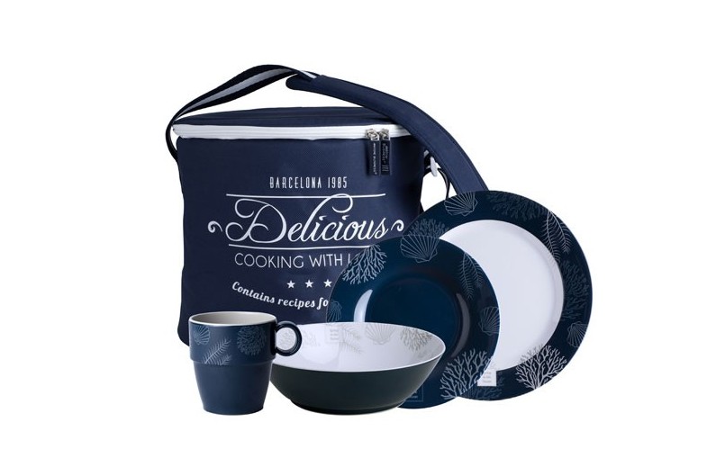 Set de 24 piezas, que incluye: 6 platos planos, 6 platos hondos, 6 platos de postre, 6 tazas mug y bolsa de transporte.