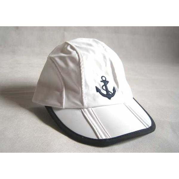 Gorra de marinero de color blanco, con logo de ancla bordado en azul. Diseñado con aperturas de ventilación que garantizan la aeración de la cabeza. También dispone de un sistema de cremallera para separar la parte superior de la gorra y convertirse en visera. Ajustable por detrás.