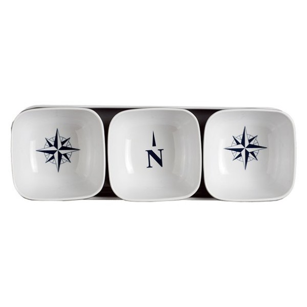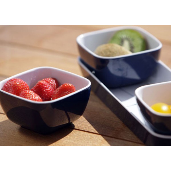 Set de 3 unidades de bols para snacks más bandeja, de precioso diseño, de color blanco y azul.