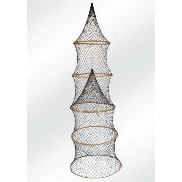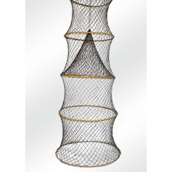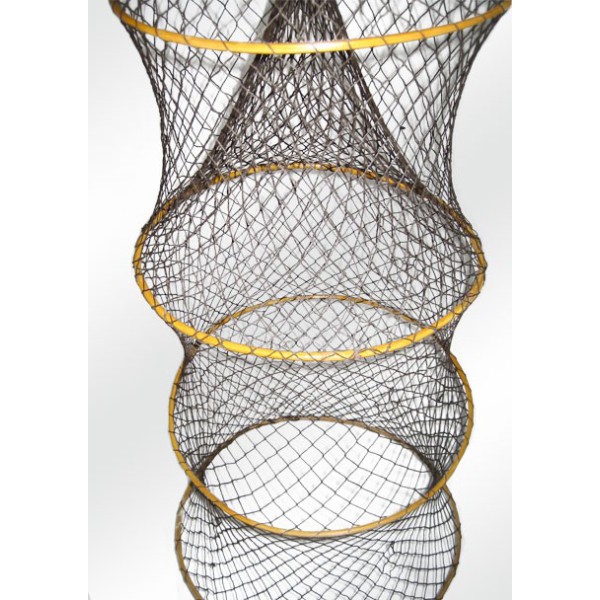 Nasa acordeón realizada con red de pescador y 5 anillos de mimbre. Muy utlizada en los estanques, especialmente para la pesca de los peces-gato y en el Mediterráneo para los pecez de fondo y los cangrejos. Bonito objeto decorativo para crear un ambiente marino