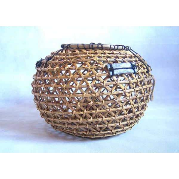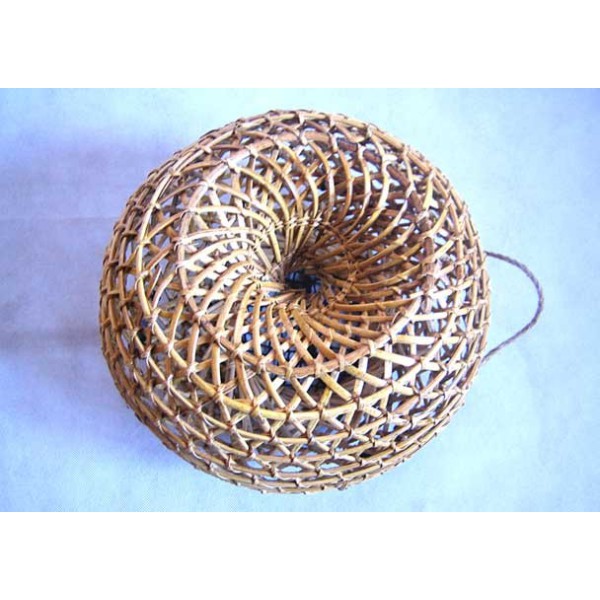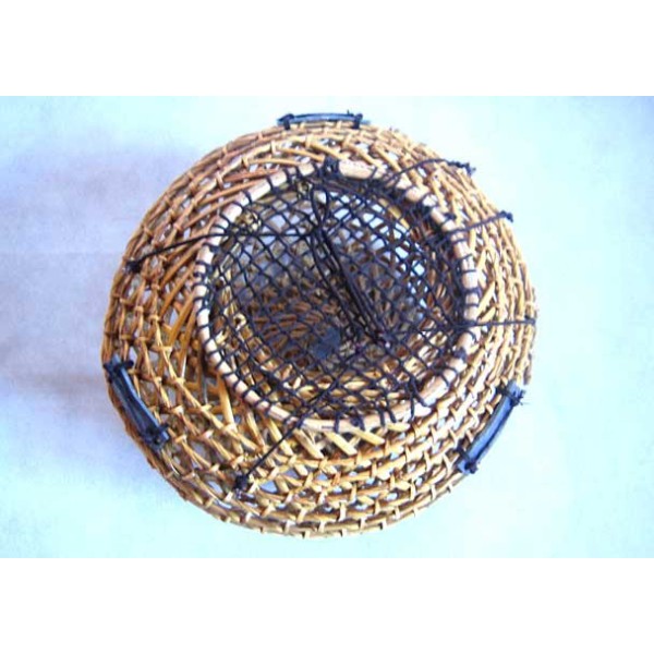 Nasa de pesca realizada en mimbre trenzado con una armadura en forma de embudo invertido dentro de la cual se colocan cebos para atrapar los peces, especialmente de roca. Objeto marino que dará un aire de vacaciones en su interior.
