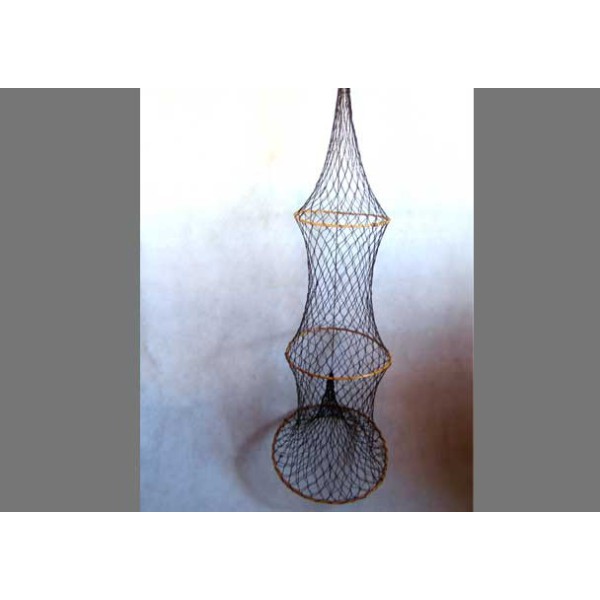Nasa acordeón realizada con red de pescador y 5 anillos de mimbre. Muy utlizada en los estanques, especialmente para la pesca de los peces-gato y en el Mediterráneo para los pecez de fondo y los cangrejos. Bonito objeto decorativo para crear un ambiente marino.