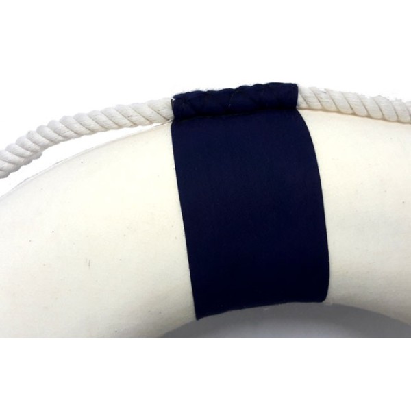 Réplica exacta de un salvavidas, ideal para dar un toque marino a la decoración. Realizado en porexpan en su interior y recubierto de una lona de algodón. La cuerda de algodón atada a su alrededor se utiliza para poder agarrarse.