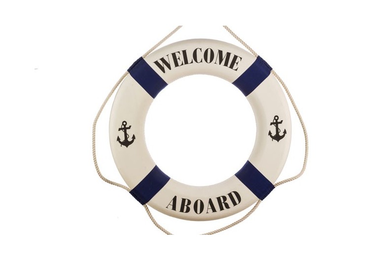 Salvavidas "Bienvenue a Bord" - "Welcome on board" reversible. Réplica exacta de un salvavidas, ideal para dar un toque marino a la decoración. Realizado en porexpan en su interior y recubierto de una lona de algodón. La cuerda de algodón atada a su alrededor se utiliza para poder agarrarse.