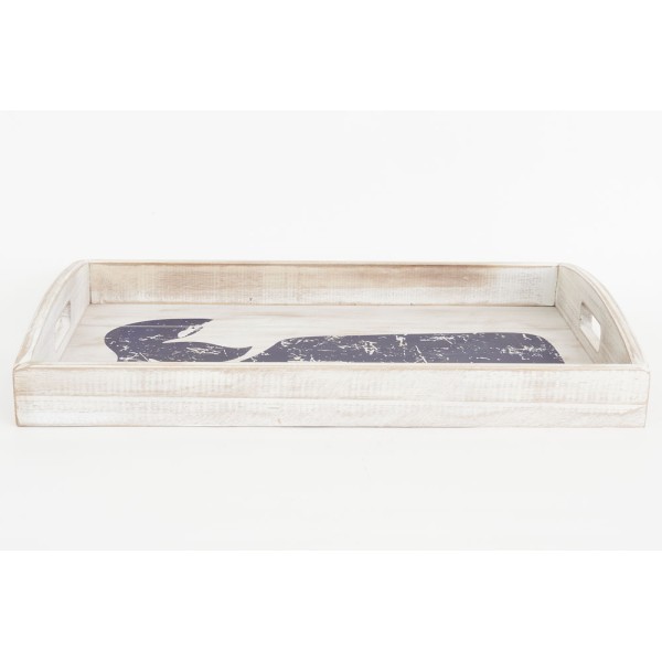 Bandeja de madera con una ballena impresa. Pintado simulando usado o antiguo, ideal para llevar el desayuno a la cama.