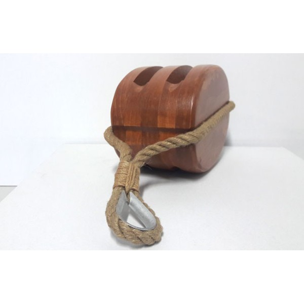 Réplique d'une poulie maritimes décoration deux yeux, faite de bois.
