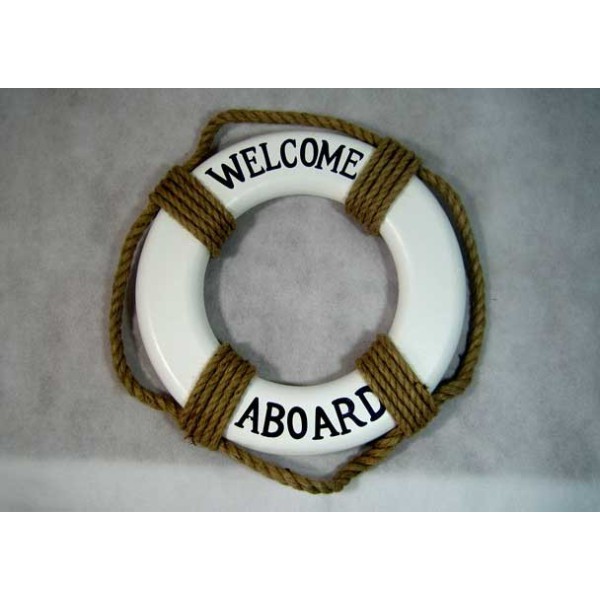Bouée de sauvetage décorative avec l'inscription "WELCOME ABOARD" de style rustique, idéale pour donner une touche marine. Réalisée en bois et entourée d'une corde en chanvre.