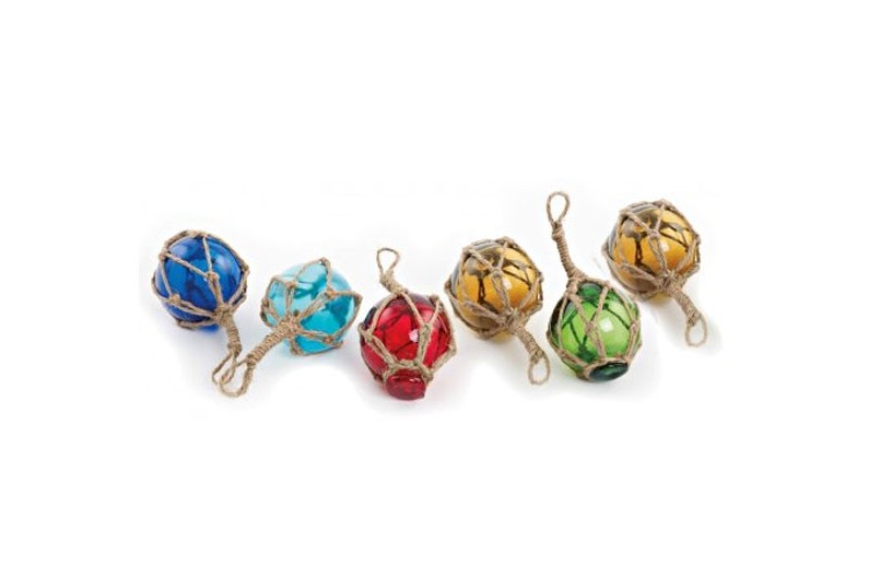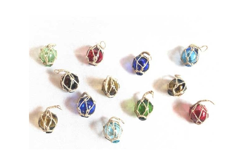 Assortiment de 12 bouées de couleurs. La bouée de casier est un ancien flotteur utilisé jusque dans les années 50, constitué d'une bouée en verre entouré d'un cordage tressé. Ces flotteurs étaient fixés sur les filets de pêche pour qu'ils restent à la surface, tout en dérivant emportés par le courant.
