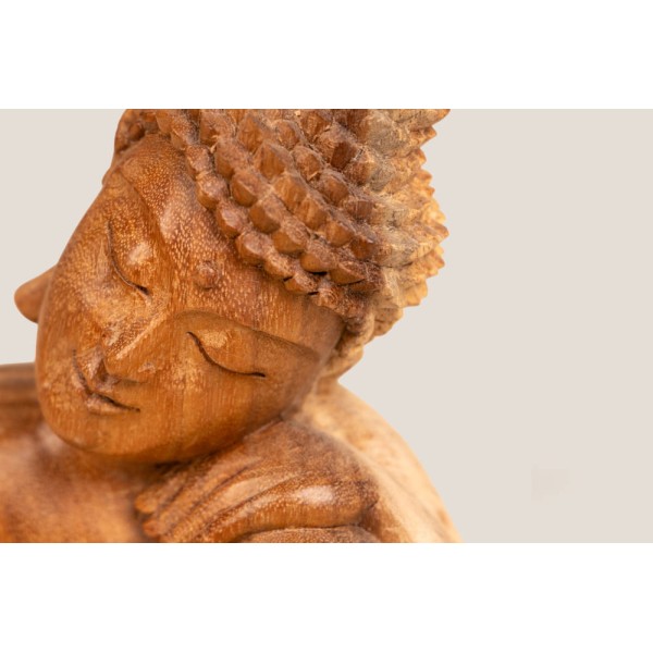 Bouddha méditant en bois de suar avec une robe blanche. Fabriqué à la main en Indonésie, pièce unique.