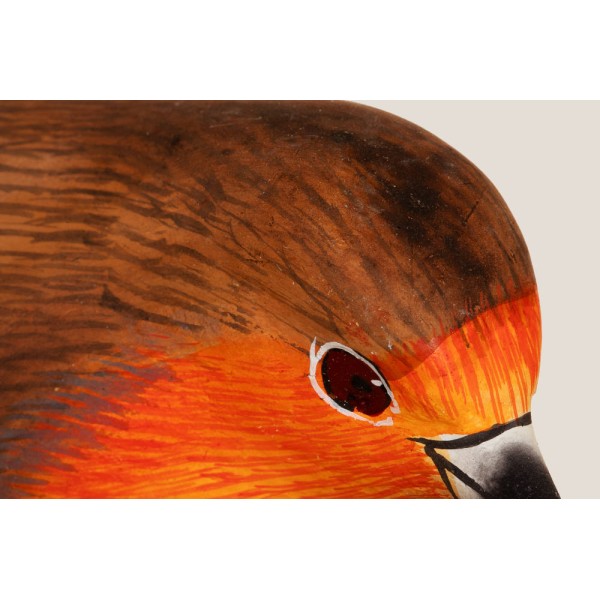Oiseau des bois d'Albasia, de l'espèce "Rouge-gorge", avec un pied en tronc de bois. Fabriqué à la main en Indonésie, pièce unique.