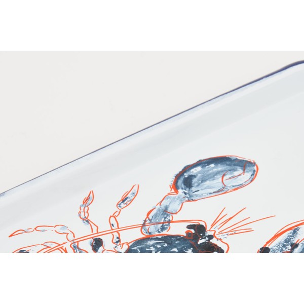 Plateau en métal émaillé blanc, avec un homard imprimé.
