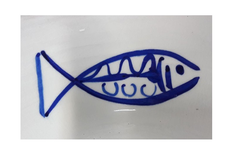 Plateau en céramique non poreux avec impression de poisson bleu. Idéal pour présenter de grandes quantités dans le tableau. Résistant à lava-vaisselle.