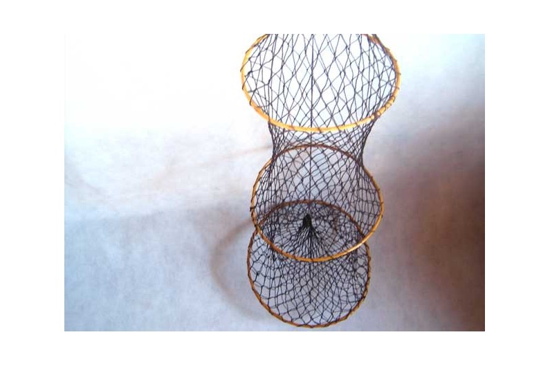 Nasse accordéon faite de filet de pêche et 5 anneaux en osier. Très utilisée dans les étangs, notamment pour la pêche des poissons-chats ainsi qu'en Méditerrannée pour les poissons de fond et les écrevisses. Bel objet décoratif pour créer une ambiance marine.