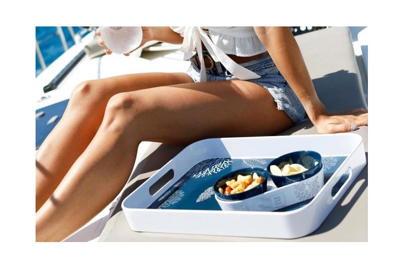 Plateau rectangulaire très beau design, fond de couleur bleu.