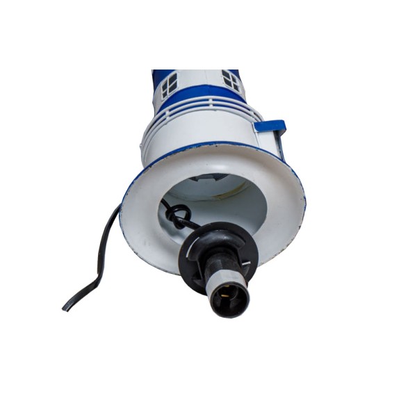 Phare en métal rayé bleu et rouge avec lumière. La douille de phare (E14) se trouve sous le phare. Cette phare est conçue pour une utilisation en intérieur et fonctionne avec de l'électricité 220 V. La longueur du câble est de 1,5 m et il dispose d'un interrupteur pour allumer la lumière du phare.