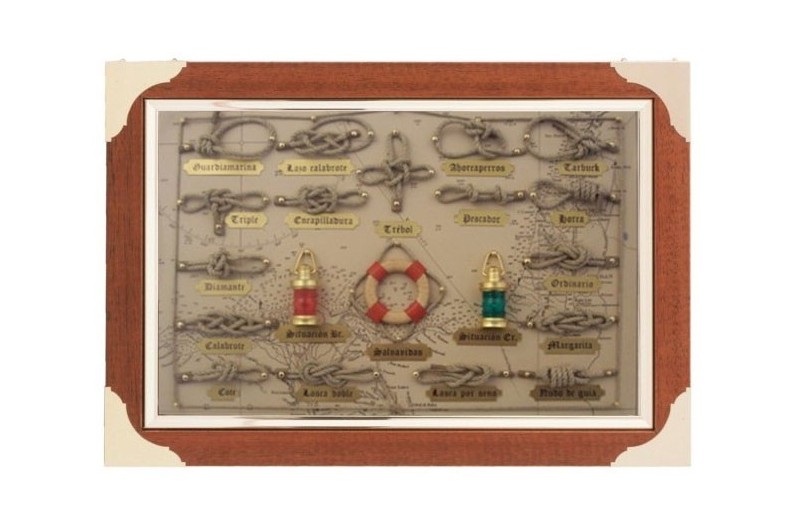 Belle tableau décorative des noeuds marins et des cordes, avec nombreux objets marins. Tableau en bois et protégé par un verre. La corde qui utliza est coton. Chaque nœud porte une plaque avec son nom gravé.