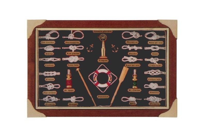 Belle tableau décorative des noeuds marins et des cordes, avec nombreux objets marins. Tableau en bois et protégé par un verre. La corde qui utliza est coton. Chaque nœud porte une plaque avec son nom gravé.