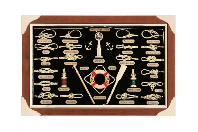 Belle tableau décorative des noeuds marins et des cordes, avec nombreux objets marins. Tableau en bois et protégé par un verre. La corde qui utliza est coton. Chaque nœud porte une plaque avec son nom gravé.