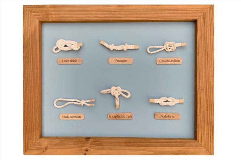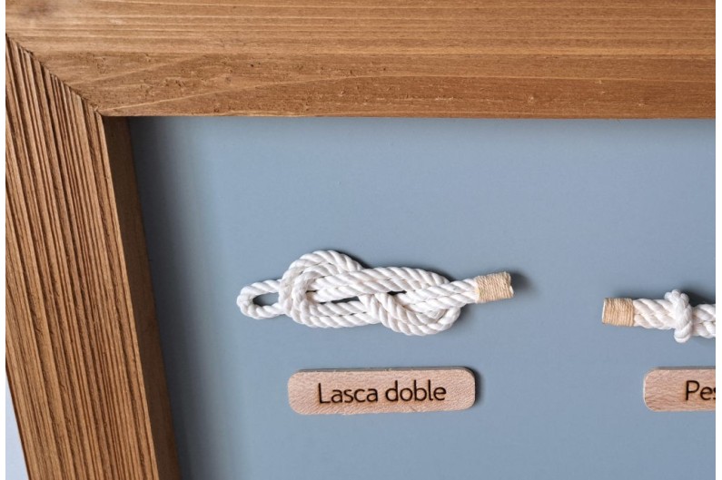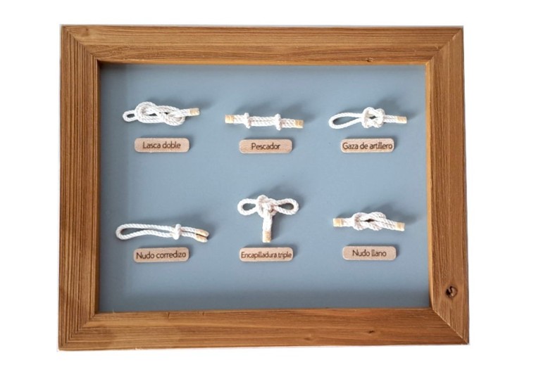 Belle tableau marin. Son arrière-plan représente un diagramme nautique de temps, décoré avec une hélice en or et de nombreux objets de marine. Avec tableau avec des bords arrondis en bois massif. Tous les noeuds sont faits de corde de coton et porte une plaque avec son nom gravé