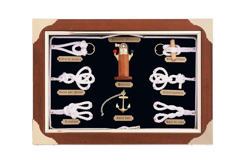 Belle tableau décorative des noeuds marins et des cordes, avec nombreux objets marins. Tableau en bois et protégé par un verre. La corde qui utliza est coton. Chaque nœud porte une plaque avec son nom gravé.