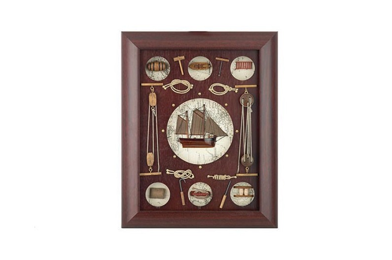 Belle tableau de noeuds marin. Son arrière-plan représente un diagramme nautique de temps, décoré avec un bateau en or et de nombreux objets de marine. Avec tableau avec des bords arrondis en bois massif. Tous les noeuds sont faits de corde de coton et porte une plaque avec son nom gravé