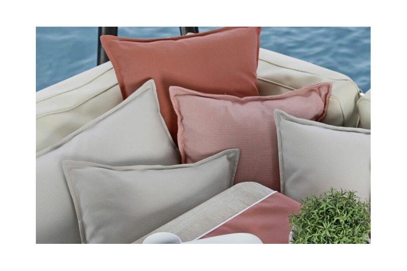 Lot de deux coussins ARUBA résistants à l'eau. Ils sont fabriqués en polypropylène, un tissu imperméable qui empêche l'eau de pénétrer à l'intérieur et qui est facile à laver avec juste un chiffon humide.