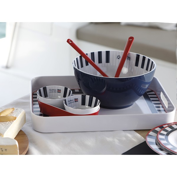 Plateau rectangulaire, avec un beau design, avec un fond blanc et des rayures bleues et rouges.