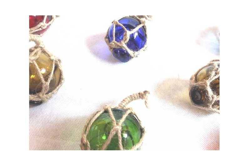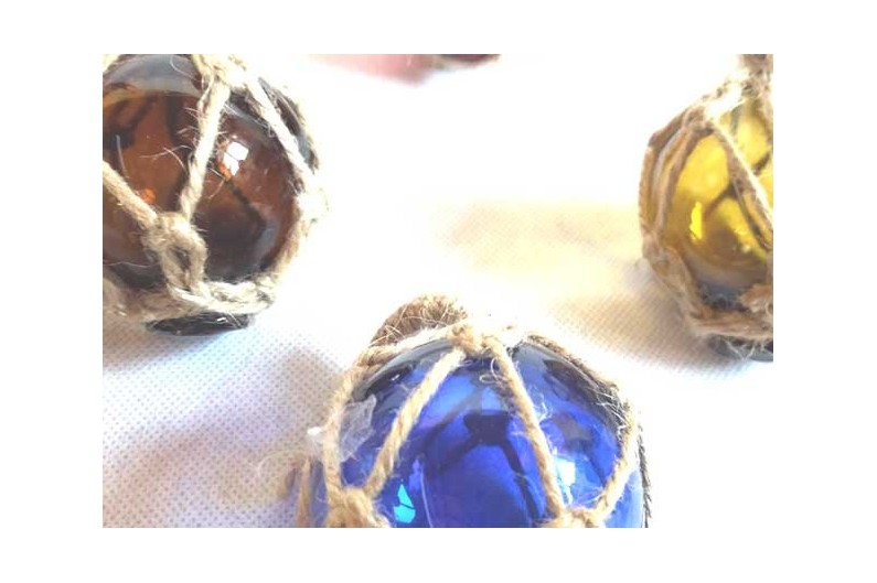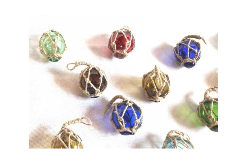 Assortimento di 12 boe colorate. La boa da pesca era un antico galleggiante costituito da una palla di vetro avvolta attorno ad una corda intrecciata. Fu utilizzato fino al 1950. Questi galleggianti erano attaccati alle reti da pesca in modo che rimanessero in superficie mentre andavano alla deriva nella corrente.