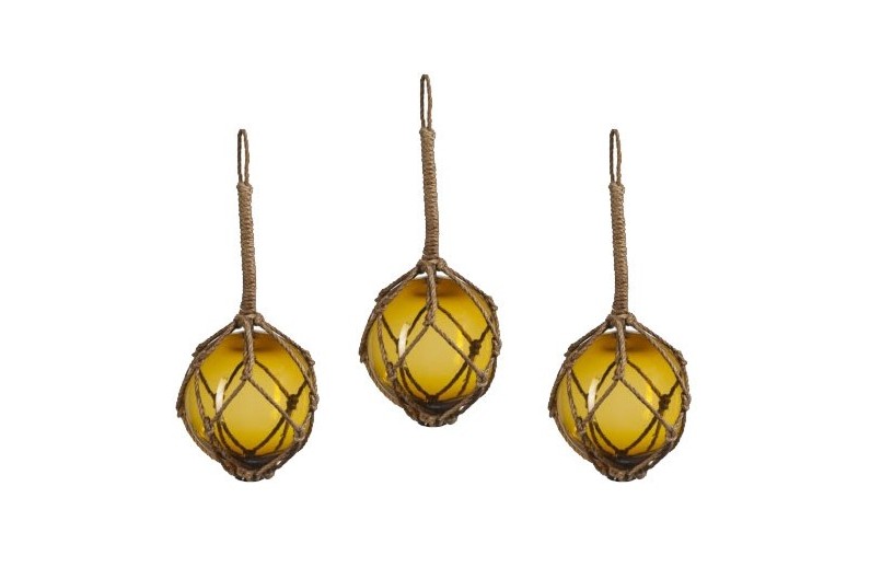 Set di 3 boe da pesca. La boa da pesca era un antico galleggiante costituito da una palla di vetro avvolta attorno ad una corda intrecciata. Fu utilizzato fino al 1950. Questi galleggianti erano attaccati alle reti da pesca in modo che rimanessero in superficie mentre andavano alla deriva nella corrente. Oggetto che darà un tocco marino decorativo.