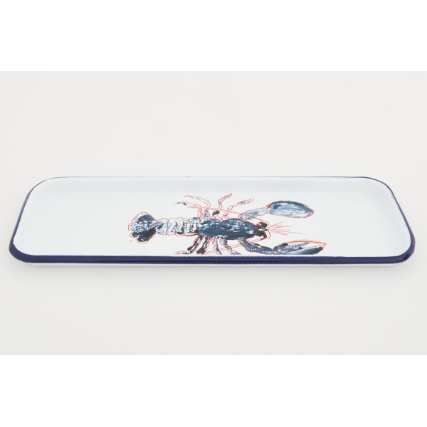 Vassoio in metallo smaltato bianco, con aragosta stampata.