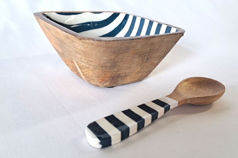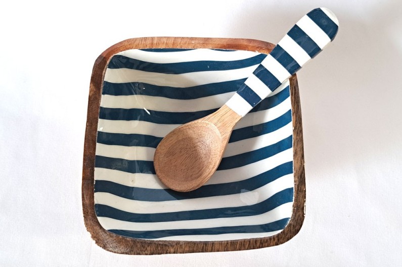Ciotola in legno smaltato, dipinto a strisce, con cucchiaio.