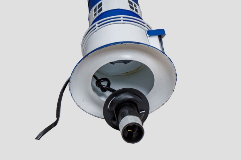 Faro anteriore in metallo striato blu e bianco con luce. Il portalampada (E14) si trova sotto il faro. Questa lampada frontale è progettata per uso interno e funziona con elettricità a 220 V. La lunghezza del cavo è di 1,5 me dispone di un interruttore per accendere la luce del faro.