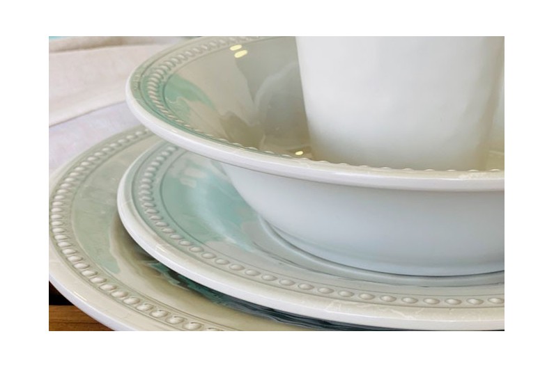 Set da 24 pezzi, che comprende: 6 piatti piani, 6 piatti fondi, 6 piatti dessert, 6 tazzine e borsa per il trasporto. Serie Perla.
