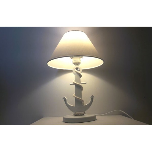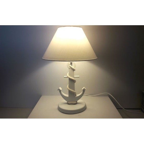 Lampada originale con piede di ancoraggio in stile marinaro. Il piede di ancoraggio marino è in legno di pino. La corda è di cotone.
