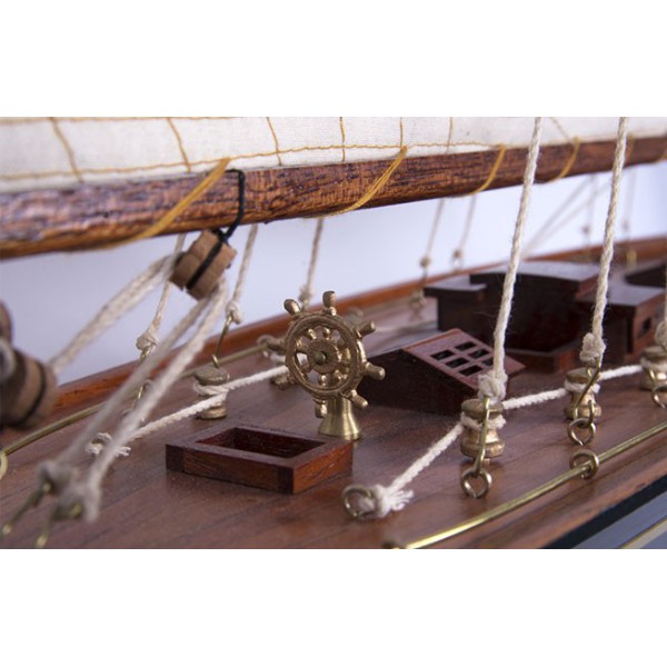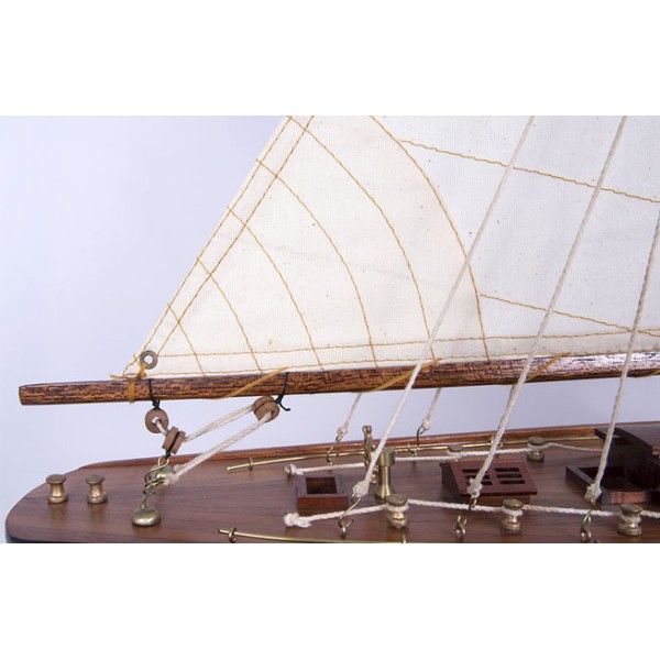 per la Endeavour modelship Cup America nel 1934. Dopo aver preparato la sua campagna a Shamrock V, Sopwith voleva assicurarsi che questo yacht fosse il design più avanzato possibile. Con la sua esperienza nella progettazione di velivoli con tecnologia aeronautica e verricelli ne fanno la migliore barca del suo tempo. Dal suo crollo nel 1934 ha continuato la sua preparazione gareggiando contro Shamrock V (allora di proprietà di Sir Richard Fairey) e il Velsheda di nuova costruzione (di proprietà di WL Stephenson). Ha navigato con l'intera flotta da regata britannica e ha conquistato il cuore dei velisti di tutto il mondo, vincendo molte regate nella sua prima stagione. Come molti prima di lui, Endeavour non ha vinto l'America's Cup, ma si è avvicinato come qualsiasi altro contendente. Come puoi vedere nel modello della barca a vela Endeavour, è stata una pioniera nell'avere una vela di prua (fiocco) di forma quadrilatera. Non vediamo nella sua riproduzione in miniatura l'enorme spinnaker che possedeva.