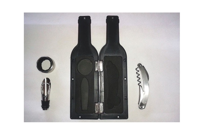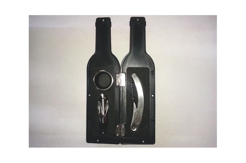 Bottiglia da sommelier "LA CUVEE DU MARIN", composta da 3 accessori per la degustazione dei vini: un apriscatole in acciaio inox, un anello antigoccia, 1 versatore in metallo cromato. La bottiglia ha una chiusura magnetica ed è realizzata in plastica