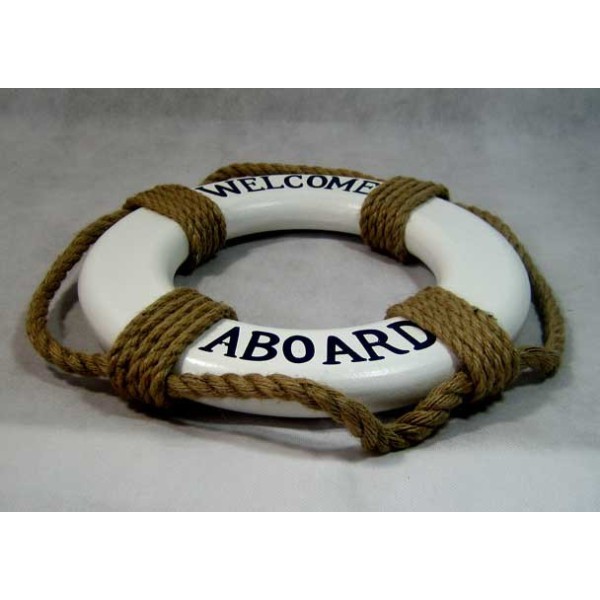 Salvagenti con la scritta "WELCOME ABOARD" in stile rustico. L'oggetto ideale per dare un tocco marino alla decorazione. Realizzato in legno con una corda di canapa legata attorno.