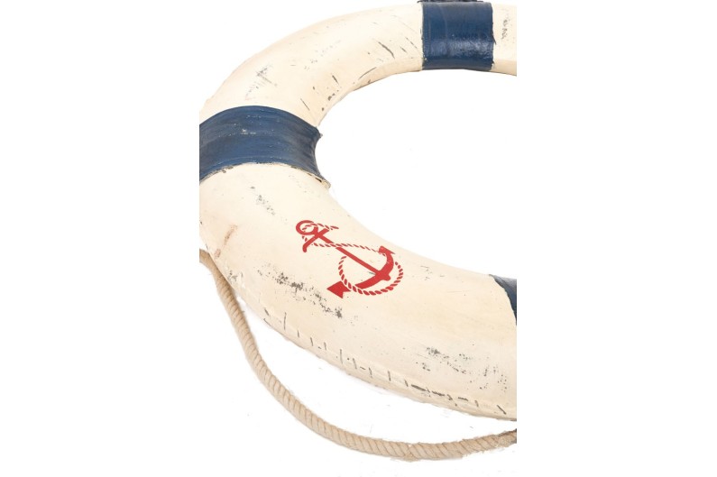 Replica esatta di un salvagente, ideale per dare un tocco marino alla decorazione. Realizzato in porexpan all'interno e ricoperto da una tela di cotone. La corda di cotone legata attorno ad esso serve per potersi trattenere.