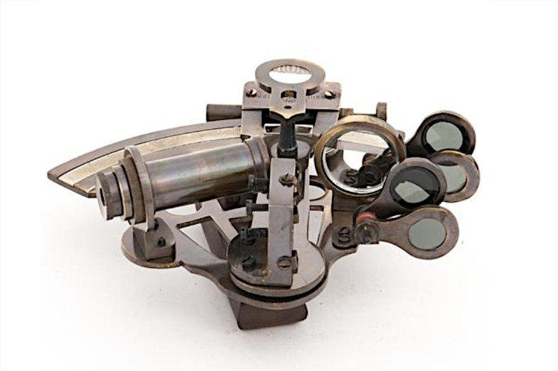 Bella replica di un sestante Kelvin & Hughes 1917, realizzato in ottone lucido. Include scatola di legno foderata all'interno, con scritta. La lunghezza dell'arco è di 15 cm. Il suo utilizzo deve essere esclusivamente decorativo.