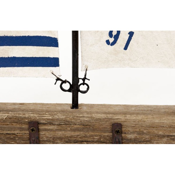 Cabide chaves em forma de veleiro, feito à mão de madeira, aço e com velas de algodão.
