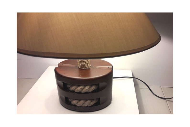 Candeeiro da polia. Lâmpada decoração náutica em uma madeira dupla roldana, patinado idade. A espessura roldanas cânhamo decorar.