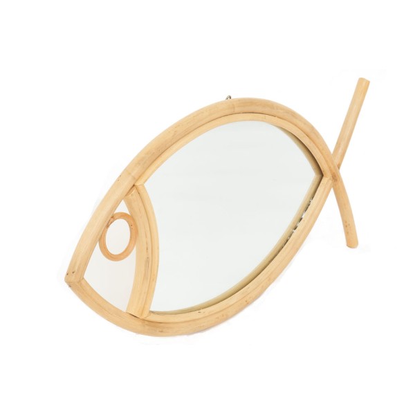 Espelho em forma de peixe com moldura de madeira. Feito à mão.