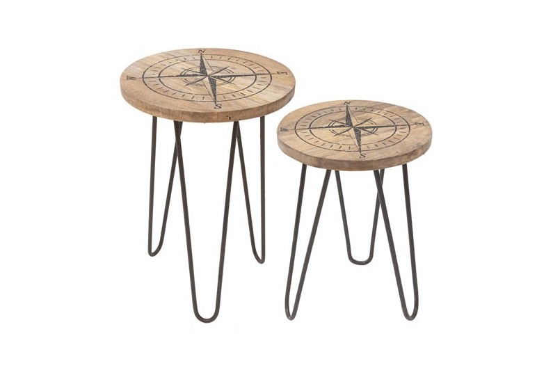 Conjunto de 2 mesas de madeira com a Rosa dos Ventos, com pés de aço preto.