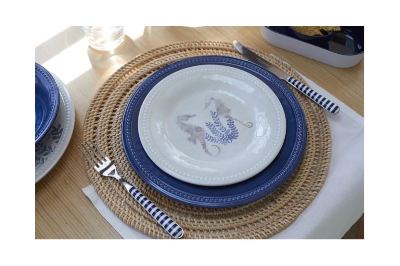 Conjunto de 6 unidades de prato raso de belo desenho, cor azul.
