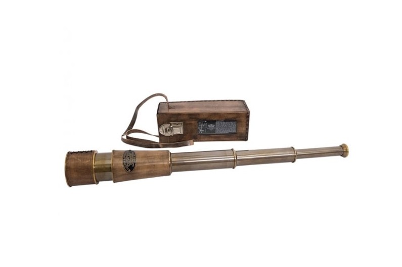 Bonita réplica de um óculo velho simulado, feito de bronze, latão e couro, com um tratamento especial. Inclui caixa de couro com âncora inscrita. Depois estendeu o óculo tem um comprimento de 59 cm. Ele funciona perfeitamente, mas seu uso deve ser exclusivamente decorativo.