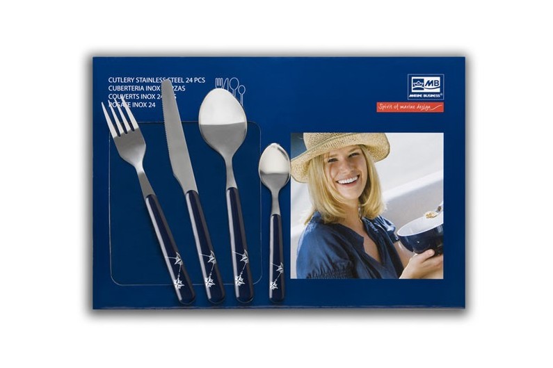 Conjunto de 24 peças faca, garfo, colher e colher de sobremesa.