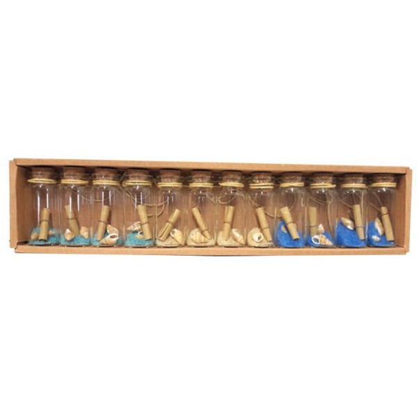Conjunto de 12 garrafas de vidro com areia, conchas e pergaminho.