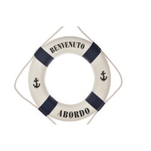 Salva-vidas "Bienvenido a Bordo" - "Benvenuto Abordo" reversível. Réplica exata de uma vida, ideal para dar um toque à beira-mar para a decoração. Feito em porexpan dentro e coberto com uma lona de algodão. A corda de algodão amarrado em torno dele usado para segurar.